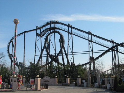 Ich bin schon mit vielen Achterbahnen gefahren aber gestanden bin ich noch nie. Hat aber echt spaß gemacht. Die 914 m lange Strecke erreicht eine Höhe von 33 m. Looping, Korkenzieher alles dabei.